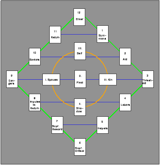 The outer square (or diamond) of the spread represents the Heroic Journey, as