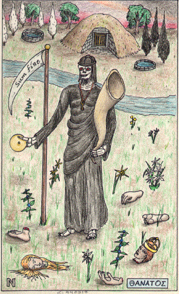 In my image, I have compromised by giving Death a staff with a banner that suggests a scythe's blade. The inscription, "Sum finis" (I am the end), appears in Italian (Son fine) on a Visconti-Sforza Death trump in the Victoria and Albert Museum (Dummett 126; cf. Kaplan I.104). The rod also reminds us that XIII.Death is the Principal of the Sceptre, complementing XII.Hanged Traitor, his Second, since death is often the punishment of the traitor, and follows his defection in time. Prometheus' sceptre brings illumination; Hades' sceptre brings darkness.