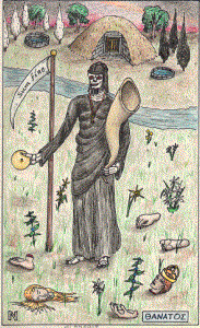 It might be argued that XIII.Death with his scythe should be the Lord of Necessity, associated with Swords, and the XI.Old Man with his staff should be the Principal of the Sceptre. I have not done this, because (1) the Old Man is, in fact, Father Time, Saturn, who is an agricultural deity and associated with the sickle; (2) the scythe seems to a comparatively late attribute of Death, probably resulting from a confusion with Saturn; (3) there is no particular reason to associate the Old Man with a staff, once we realize he is Saturn, not a Hermit; (4) Hades is commonly shown with a wand (analogous to Hermes' caduceus), but not with a scythe or other blade. Finally, we must note that that Empedocles associates Hades with Fire (and hence the Wands), for he is custodian of the Central Fire (Kingsley).