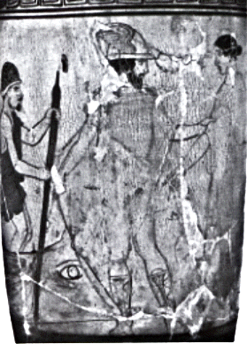 A dark river runs across the background; behind it is a tholos (a beehive-shaped tomb), into the door of which is set an imposing bronze gate. Cypresses and white poplars grow around it. There are two well-springs, one on each side of the mound; a white cypress grows by that on our left, and a dark cypress by that on our right. The sky glows dark red, but we cannot tell if it is sunrise or sunset.