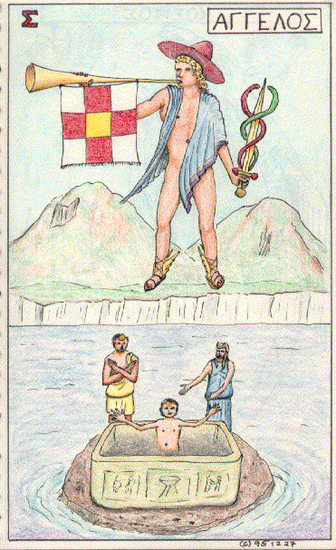 Note that Latin angelus is a late formation (from Greek angelos, messenger or envoy) used only in a Christian context; in classical Latin nuntius has approximately the same meaning as Greek angelos (Smith's Eng.-Lat. Dict. s.vv. angel, messenger). Hermes is, of course, the archetypal angelos. Indeed the tarot angel is sometimes identified with St. Michael, who in Christian tradition blows the trumpet to call the souls on Judgement Day. Michael is associated with planet Mercury, and hence with Hermes Psychopompos, or Guide of Souls. (Sharman-Burke 114)