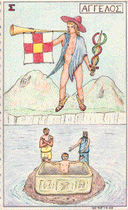 The primordial couple floating in an arc on the cosmic womb represent the seeds of the next creation. Thus, on an ancient Day of Judgement, Zeus decided to destroy the corrupt world, and after blasting it with his bolt (15.Tower), called on Poseidon to flood the land. Only Deukalion and Purrha survived, in a chest (Gk. larnax = Lat. arca), and they sowed the seeds of a new, better race of people; the seeds were stones, the "bones of Mother Earth." In Apollodorus' account (Bibl. I.vii.2), the arc floated for nine days and nights, nine being the number of 19.Angel in its Hendecad. Further, it was Hermes who heralded the end of the rain and directed this act of (re)creation. (Gantz 165; Walker 130)