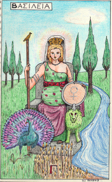 The Empress corresponds to the Bride in the Sacred Marriage; in Sumerian-Akkadian mythology she is Inanna, Astarte, Ishtar, the Queen and Sister of the King and Shepherd, Dumuzi/Tammuz. Because she is also a war goddess, she gives the King his arms. (Kramer, Sac. Mar.) Similarly, Aphrodite was occasionally shown armed and wearing a helmet, especially at Sparta (OCD s.v.; Larousse 130), and as a goddess of the state, Juno Regina was shown armed and wearing a goatskin cloak (OCD s.v.).