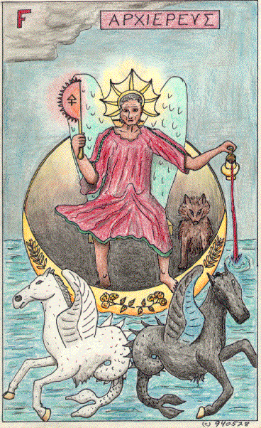 The numerical value of HELIOS SKOTAIOS (Heelios Skotaios, The Sun at Night-time) is 1194, which reduces to 11+4-9+1-1 = 6; also the value of O EKABOLOS (Hekabolos, the Far-Darter, i.e. Apollo) is 468, which reduces to 8-6+4 = 6. Thus the High Priest has the character of the Hexad, which means that it places bounds on the spiritual world (opened by IV.High Priestess); the Pythagoreans call it Reconciliation, Panacea (All-healer), Hugieia (Health), Maker of the Soul and Condition of Life. (TA 43-5, 48; see the meaning of Wau, above, and the discussion in the Tens of the Minor Arcana).