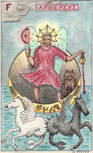 The High Priest is a grey-haired, beardless old man, ithyphallic, with ruddy skin and folded wings. He is barefoot, wears a radiate crown of red gold with seven rays curving upward, and a long, gauzy red chiton (tunic), sleeves to elbows, which billows in the wind. In his right hand he holds the handle of a pruning saw in the form of a sideways metal semicircle, which glows red-hot, with 16 teeth on the circumference and the alchemical symbol for sulphur (a cross under a triangle) in the middle. In his left hand he holds a golden vase, from which he pours red wine into the ocean.