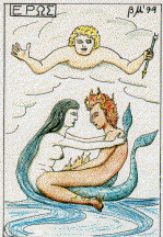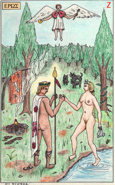 The hexagram is the symbol of the sacred union that balances the oppositions, for it is simultaneously the superimposed triangles of Fire and Water, and the superimposed signs of Air and Earth (Nichols 137). Thus all four aspects of the psyche, male and female, immanent and transcendent, are brought together, the conscious and the unconscious united in balance (see also V.High Priest) (von Franz 164). As noted in our discussion of the Minor Arcana, the Pythagoreans say that the hexad is the principle of harmony, for it is the product of the dyad and the triad, which generate every perfect consonance. They also say that it reconciles opposites, is equal to its own parts, and is called Wholeness. In our representation, Eros wears a six-pointed star.
