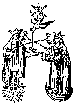 VI.Love in the Visconti-Sforza tarot is similar to ours: woman on right, man on left, right hands clasped, blindfolded naked Cupid above, aiming a dart at the man. The general scene is depicted in many alchemical illustrations, for example the second woodcut of the Rosarium Philosophorum (1550) and many of its engraved variants: the couple joins their right hands, and a dove with a six-pointed star descends from above (e.g. Fabricius figs. 35, 36, 38). From the couple's perspective, the solar king is on the right and the lunar queen on the left, which is the usual alchemical arrangement. Apollo's right eye is visible and Artemis' left because, according to ancient tradition, the Sun corresponds to the right eye and the moon to the left (Jung, MC 97). Apollo reaches out his right hand as a sign of kindness and holds the Spear of severity in his left hand (Godwin 30). Similarly, Artemis reaches toward him with her right hand, and retains the sacred Cup in her left. For the color of Artemis' tunic, see Larousse (111, 121-2) and OCD (s.v. Artemis).