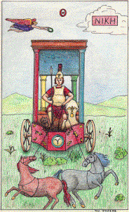 The common modern tarot sequence makes the Chariot trump 7, which number is traditionally associated with victory, fate, destiny and transformation (Cooper 94; Nichols 143). This generally agrees with the Pythagorean interpretation, which also supports the trump 8 = Justice of the modern sequence (see my interpretation of the Sevens and Eights of the Minor Arcana). Furthermore, Chariot (Ares) and Justice (Athena) form a natural pair (blind violence versus cool, intelligent courage): (1) they were both war gods and often in conflict with each other, and (2) Ares was born by Hera without benefit of a father because she was angry at Zeus for bearing Athena without benefit of a mother (Larousse 125; Oswalt 181). (Note that "Hera" is a feminine form of Greek "Heros" - OCD s.v. Hera, Hero-cult)