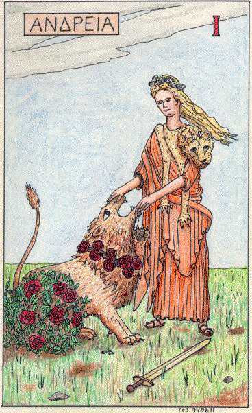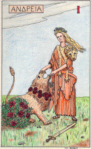 Artemis is often shown wearing an animal skin over a peplos (long dress) (OCD s.v. Artemis). It is interesting that most tarot decks depict Andreia as a cultured and refined woman, which stresses that it is not by brute force that she tames the lion, but by empathy and subtle influence (Nichols 203). We may call her "the Lady of the Beasts," or even: "the Beauty of the Beasts," with all the multiple meanings of "Lady" and "Beauty" intended.